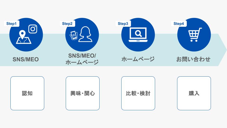 MEOは“認知と興味”を生む施策。SNSも“親しみ”を育てる施策。 これらがしっかり機能してこそ、次の「比較・検討」「申込」に繋がるのです。