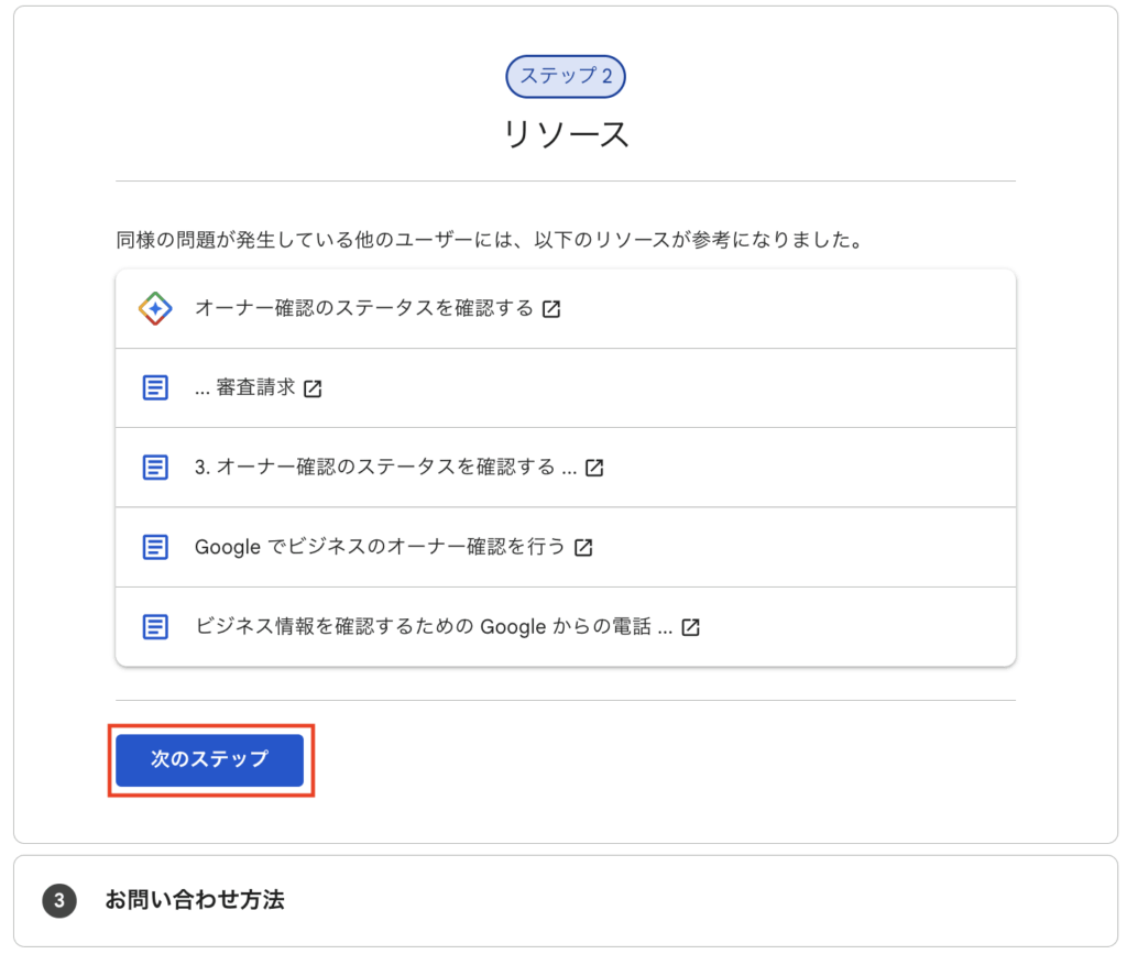 対象のビジネスとお問い合わせ内容を記載し、「次のステップ」をクリック