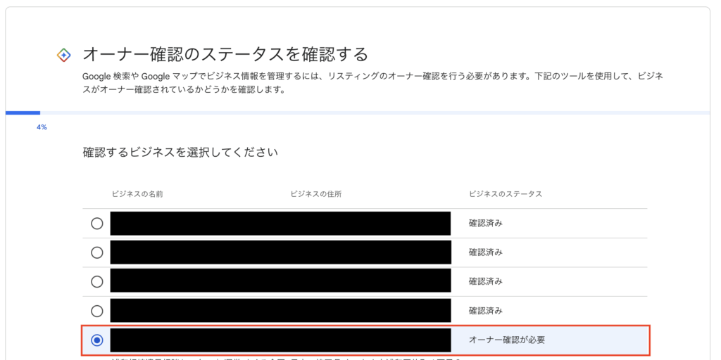 対象のビジネスを選択し、「次へ進む」をクリック