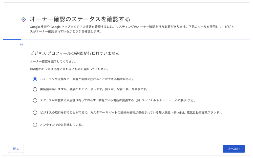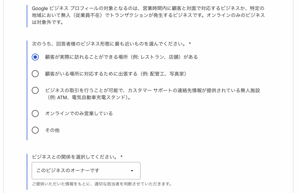 「ビジネスプロフィールがオーナー確認されていない」を選択し、以後の項目を埋めていきます。