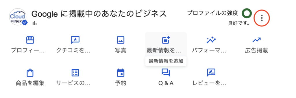 Googleマイビジネスの確認画面で右上:をクリック