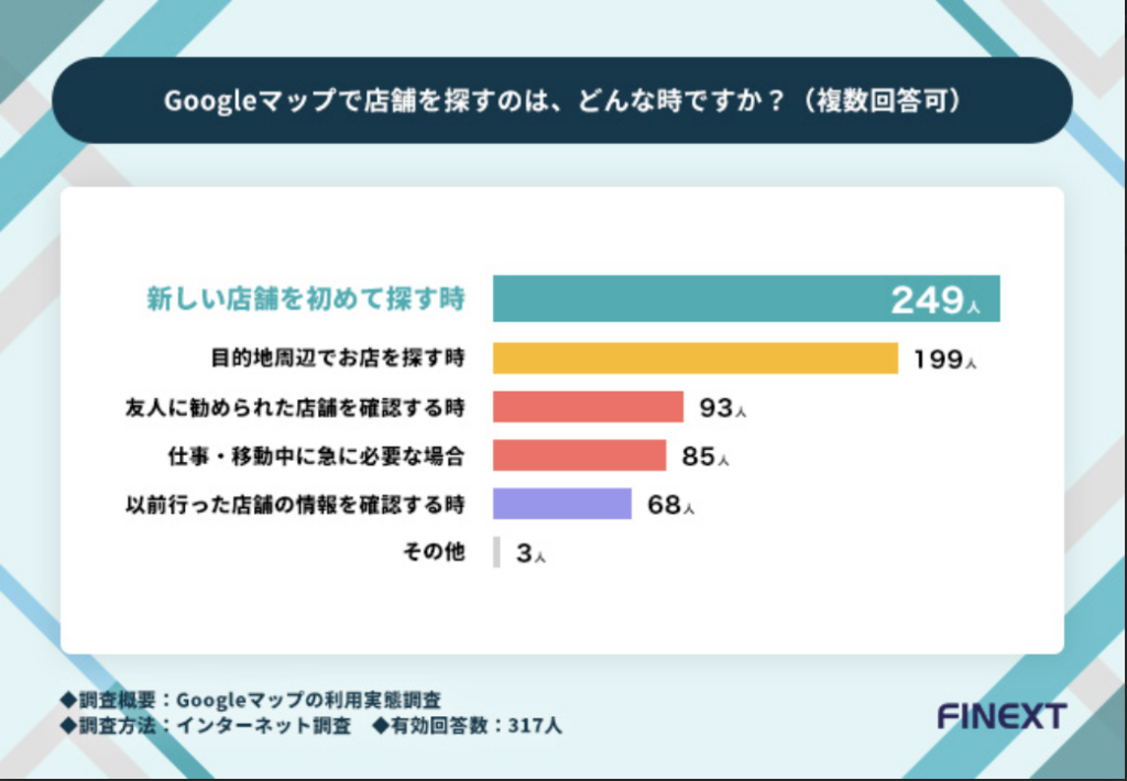 アンケート調査では「Googleマップで店舗を探すのは、どんな時ですか?(複数回答可)」という質問を行いました。
