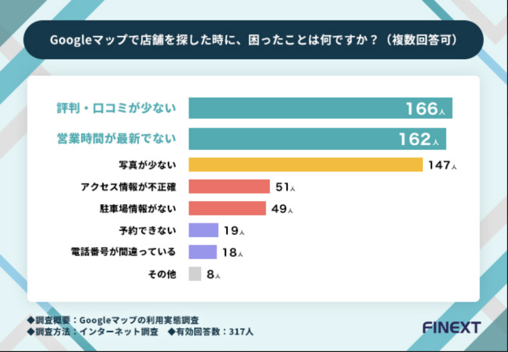 「Googleマップで店舗を探した時に、困ったことは何ですか?(複数回答可)」と質問したところ、