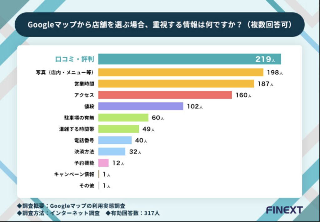 「Googleマップから店舗を選ぶ場合、重視する情報は何ですか?(複数回答可)」と質問したところ、