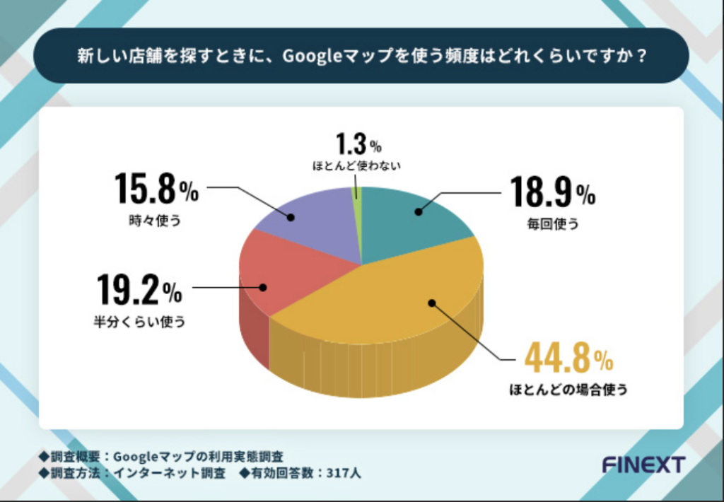 6割以上が、新規店舗を探す際にGoogleマップをほぼ必ず使用しており、