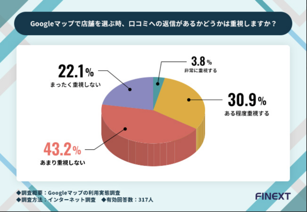 「Googleマップで店舗を選ぶ時、口コミへの返信があるかどうかは重視しますか?」と質問したところ、